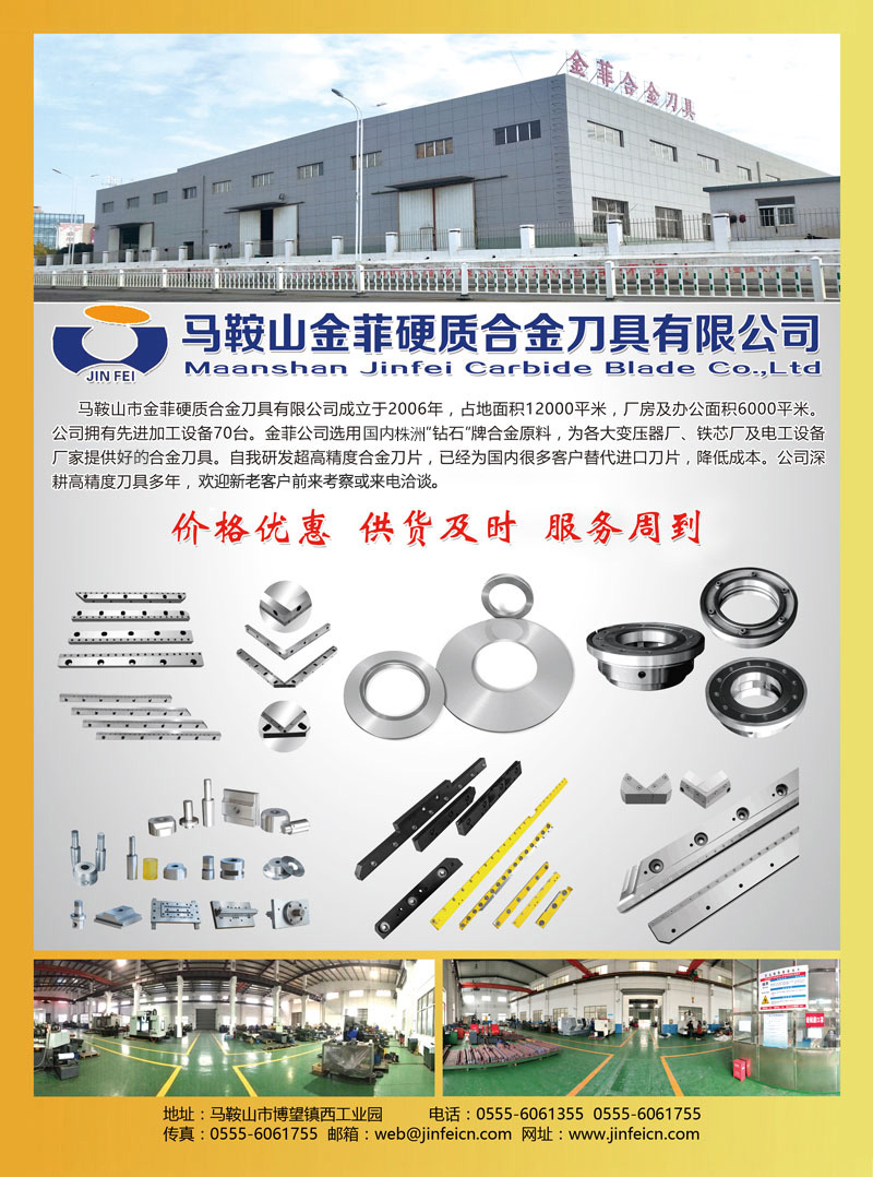 马鞍山市金菲硬质合金刀具有限公司成立于2006年,占地面积12000平米,厂房及办公面积6000平米。公司拥有加工设备70台。金菲公司选用国内有名'钻石"牌合金原料,为各大变压器厂、铁芯厂及电工设备厂家提供合金刀具。自我研发超高精度合金刀片,已经为国内很多客户替代进口刀片,降低成本。公司深耕高精度刀具多年,欢迎新老客户前来考察或来电洽谈。